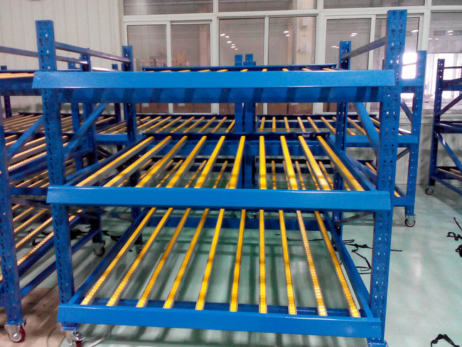 滾(gǔn)輪式貨(huò)架又稱為流利式(shì)貨架(jià),流利架:是將貨(huò)物置於滾輪上,利用一邊通道存貨,另一邊通道取貨。料架朝出(chū)貨方向向下傾斜,貨物在重力作用下向下滑動。可實現先(xiān)進先出,並可實現一(yī)次補(bǔ)貨,多次揀貨。流利架存儲效率(lǜ)高,適合大量貨(huò)物的短期存放。廣泛應用於(yú)工廠的被指生產線(xiàn)和物流配送中心的分揀區域內,尤其是可與數字(zì)式分揀係統結合起來,大大提高無聊的分揀配送效率及減少差(chà)錯。